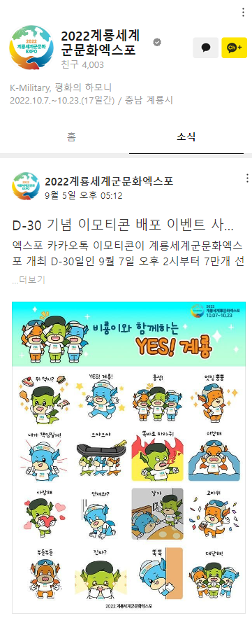 카카오톡 무료 이모티콘 계룡세계군문화엑스포 for 카카오톡 무료 이모티콘(비룡이) by 무료 세상 2022. 9. 6. 반응형 2022계룡세계군문화엑스포 for 카톡 무료 이모티콘(도달쑤) 응모 방법 : 채널 추가 당첨 방법 : 카카오톡 플러스친구 채널 추가 (이미 채널추가가 되있다면 차단 후 재 추가 하면 해결 됩니다.) 일시 : 2022년 9월 7일 오후 2시 부터 선착순 7만명 사용 기간 : 다운로드 후 30일간 반응형 공유하기 게시글 관리 카카오톡 이모티콘 저작자표시 비영리 변경금지 (새창열림) 관련글 프렌즈사천성 for 카카오톡 무료 이모티콘(하루) 광양시청 for 카카오톡 무료 이모티콘(매돌이) 네스프레소 for 카카오톡 무료 이모티콘(썸머윗네스프레소) 국제문화재산업전 for 카카오톡 무료 이모티콘(토우) 댓글